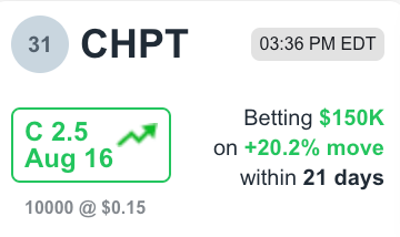 한 투자자가 2억 원 이상을 들여 CHPT의 단기 콜 옵션 10,000 계약을 계약당 $0.15에 매수했습니다. 만료일이 3주 밖에 남지 않았고 현재 주가가 행사가에 비해 20% 이상 밑에 있음에도 불구하고 베팅했다는 것은, 이 거래가 투자자가 앞으로 단기적인 주식 방향에 대해 높은 확신을 가지고 있음을 시사합니다. 이는 이 투자자가 현재 시장에서 알지 못하는 정보를 근거로 결정을 내렸을 가능성이 있습니다. 특히, 이 거래는 금요일 주식시장이 닫기 24분 전에 발생했습니다. 대부분의 옵션 트레이더들은 시간가치 하락을 피하기 위해 주말 전에 옵션 매수를 피하는 경향이 있습니다. 누군가 금요일 오후에 급하게 단기 콜 옵션을 매수한 것은 주말 동안 중요한 이벤트 또는 뉴스가 나올 수 있음을 시사합니다.